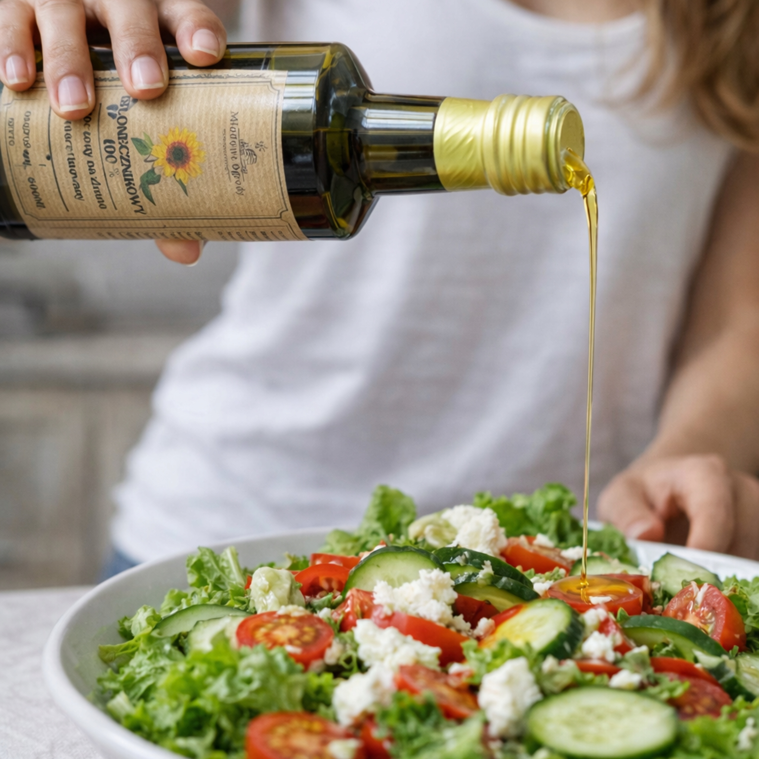 Olej ze starannie wyselekcjonowanych nasion słonecznika tłoczony na zimno, w niskiej temperaturze, aby zachować pełnię naturalnego smaku, aromatu i wartości odżywczych. Powstaje w małych partiach — świeży i prawdziwy jak natura. ?