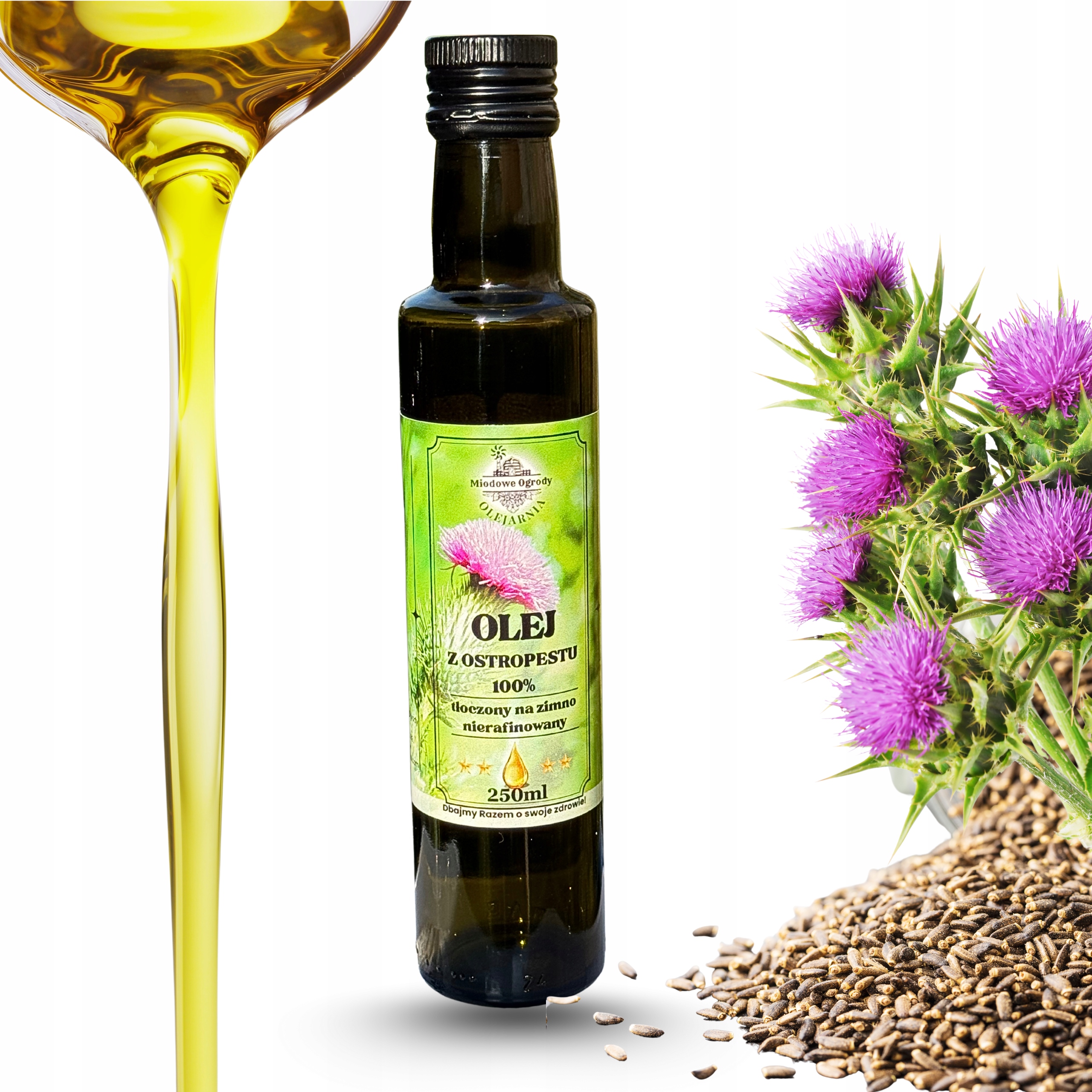 ✅ Olej tłoczony z ostropestu plamistego pochodzącego z polskich upraw.