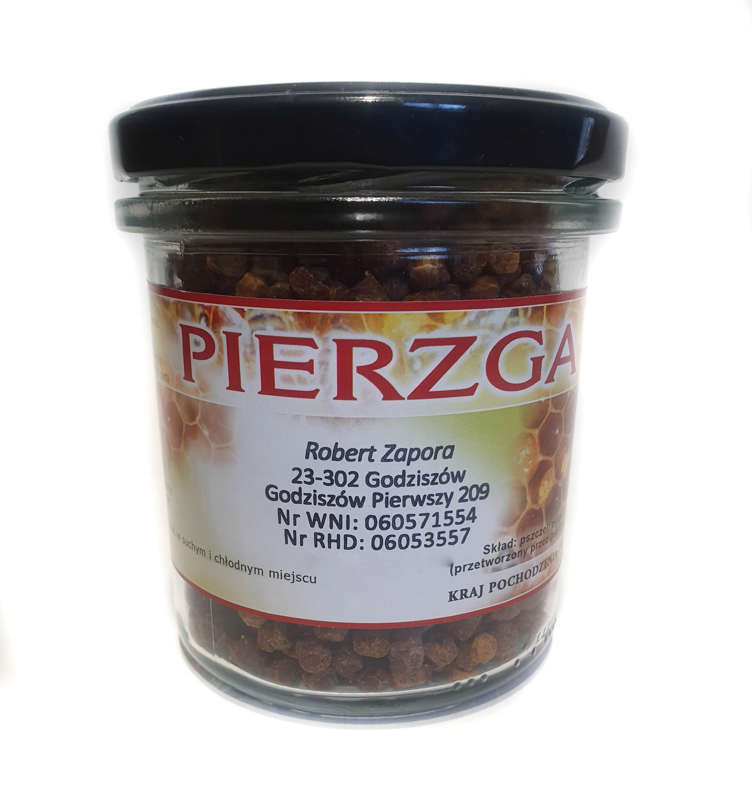 Pierzga pszczela, czyli pokarm pszczół, ma formę grudek o ciemnobrązowej barwie i nieregularnym kształcie. Pierzga powstaje z pyłku kwiatowego, który pszczoły zbieraczki transportują do ula w formie okrągłych grudek pyłkowych (obnóży). Tam pszczoły ulowe mieszają go z miodem i swoją śliną i taką masę ubijają w komórkach plastra.